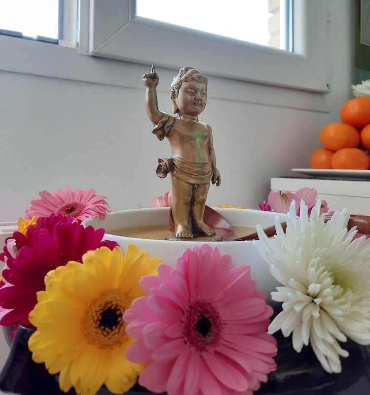 • Create your own Hanamatsuri altar: Find a large serving bowl. Place a statue of something representing the baby Buddha in the middle (this could be anything meaningful to you). Fill the bowl with sweet tea. Arrange flowers around it. See the below image for inspiration.