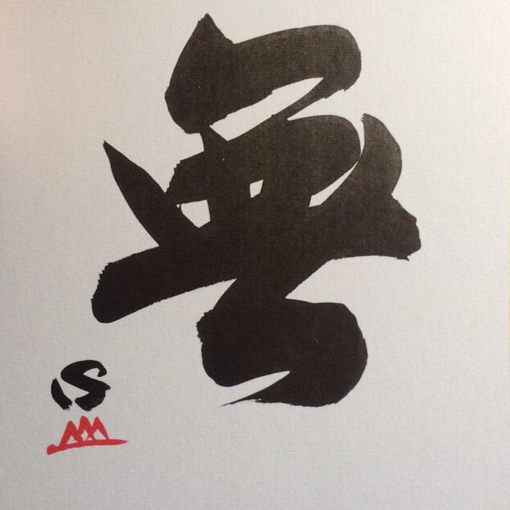 A print of a calligraphy by Shinzan Roshi. It says “mu” () meaning not/no/nothingness, together with Shinzan’s signature.