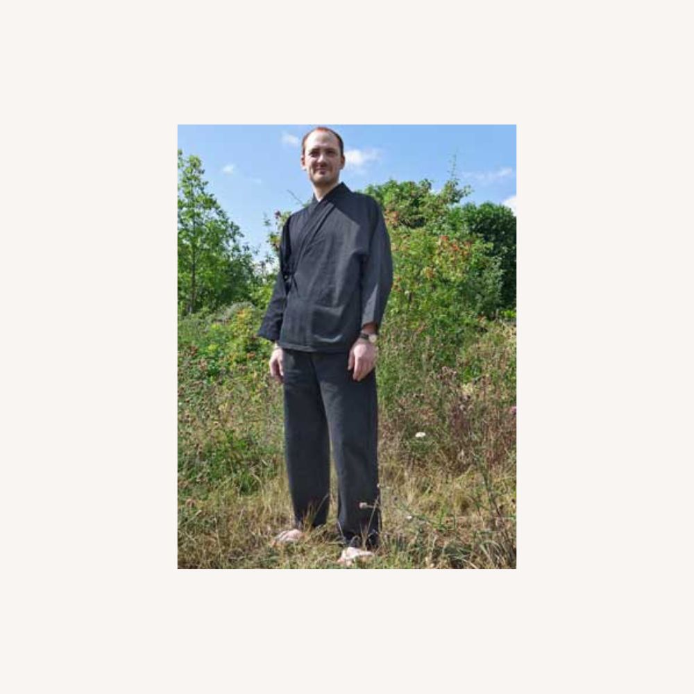 This is the workwear used in Japanese temples and daily life. It is made out of durable polycotton with the traditional openings under the arms and ribbons at the bottom of the legs to tighten them. Trousers have pockets and there is also one hidden pocket in the jacket too. The waist of the trousers is held by a ribbon to adjust the fitting.