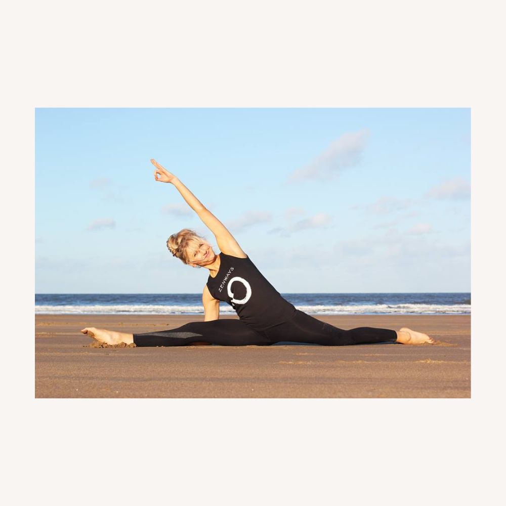 Black vest with white enso (zen circle) logo printed on the front.